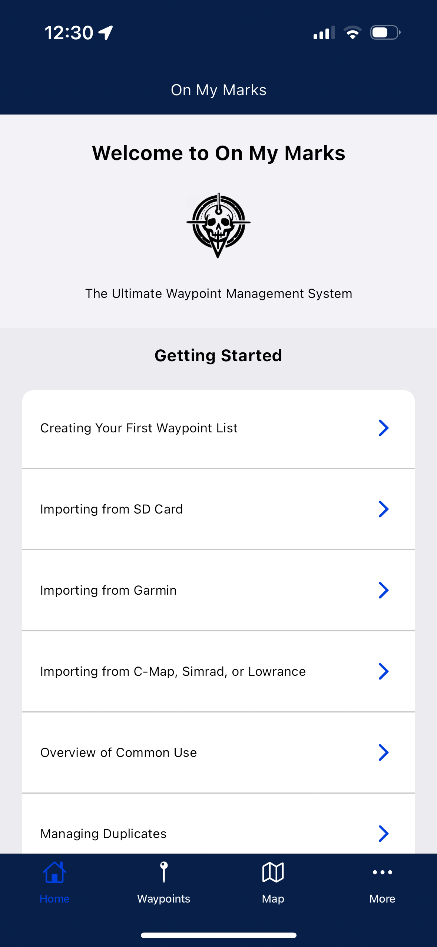 - On My Marks can read a variety of data formats, including GPX and CSV and has backend to support importing and conversion of most file formats (pending). This can be done via a SD card on computer, or via mobile through the On My Marks app using GPX apps such as Garmin’s Active Captain, C-Map, Navionics, iNavX, etc.