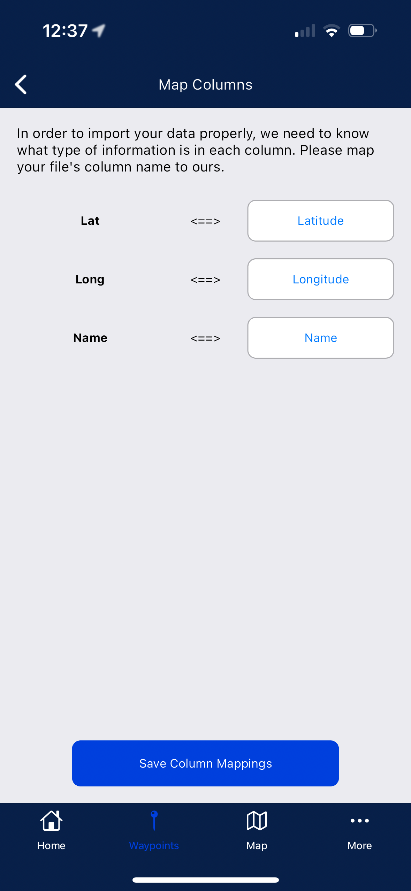 - On My Marks has the capability to import CSV files with specified column mapping to identify which columns alight with corresponding fields in GPS software, (latitude, longitude, name, description, etc)